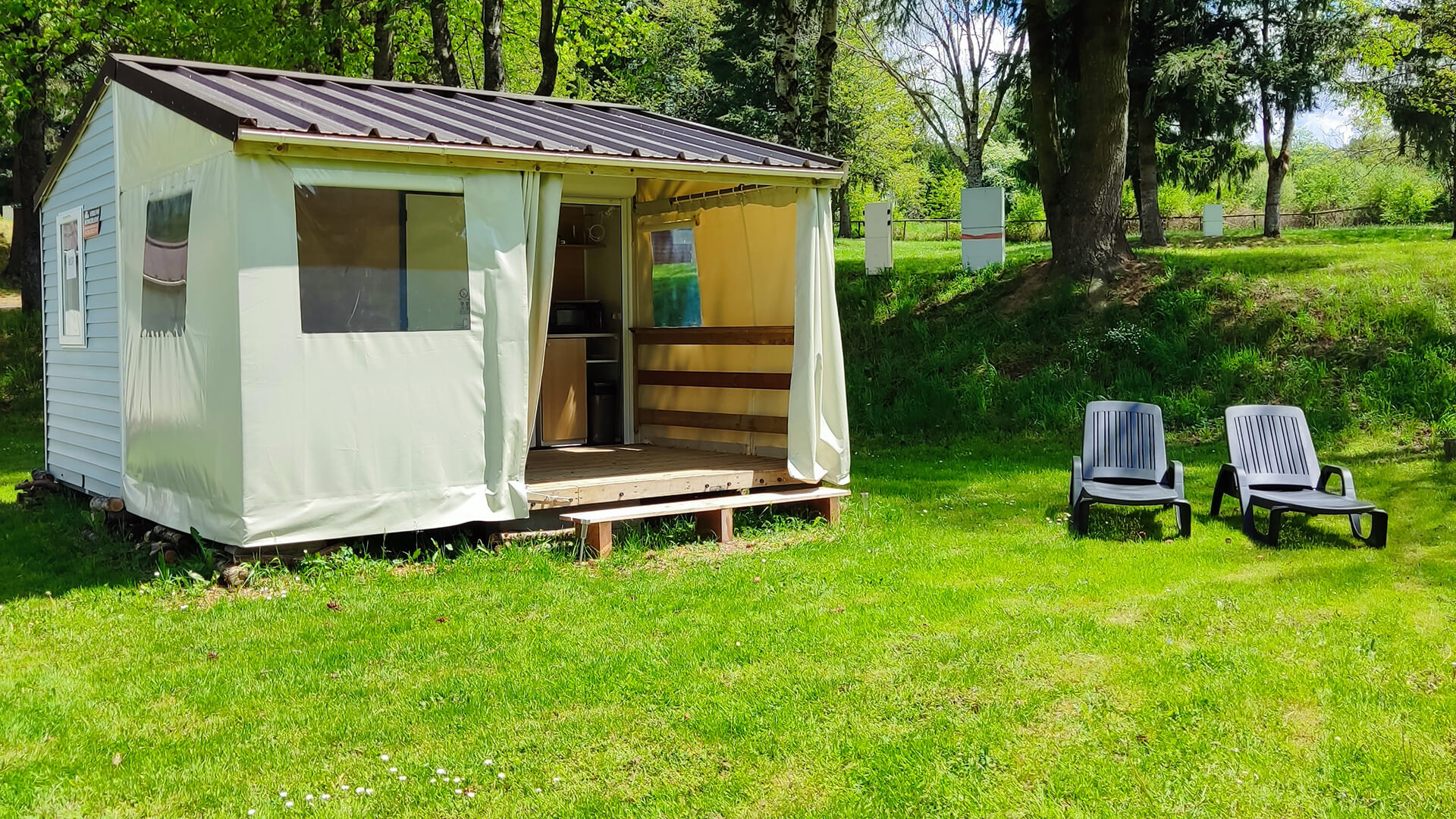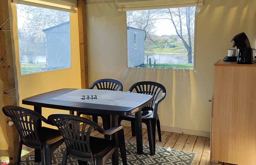 Une terrasse en bois couverte : séjour avec table et chaises, kitchenette avec plaque de cuisson 2 foyers, réfrigérateur avec petite partie congélateur, micro-ondes et machine à café.