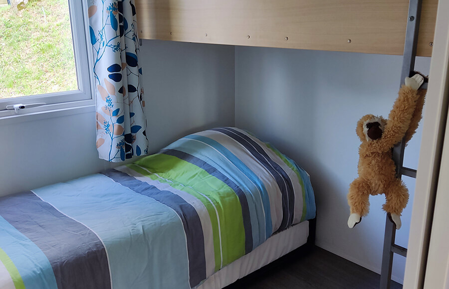 Chambre 2 : avec 3 lits simples 70x190 (dont 2 lits superposés et 1 lit gigogne), radiateur dans la partie nuit.
